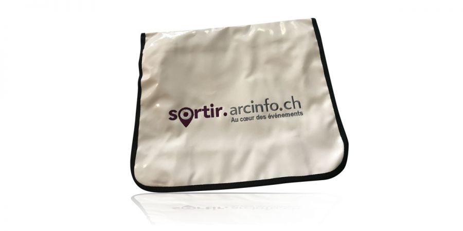 Les techniques de broderie ne se limitent pas au simple « polo ». N’hésitez pas à nous faire suivre des demandes qui pourraient paraître complexes. Nous brodons, finement, sur un vaste panel de matières et supports, dans le cas présent, une sacoche en toile PVC pour Arcinfo.