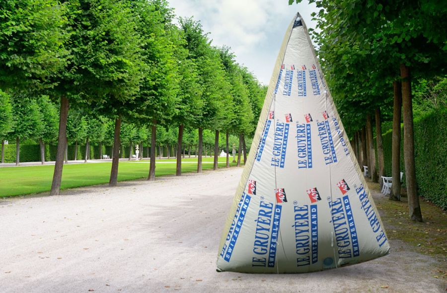 Vous voyez ici une meule de Gruyère ; cela pourrait tout aussi bien être une bouteille de vin ou un maillot de football ! Nous réalisons la forme qui vous conviendra et qui apportera le plus de crédibilité à votre marque ou votre cause. Air-Com, si vous le souhaitez, s’occupe de l’installation et du stockage de votre matériel.